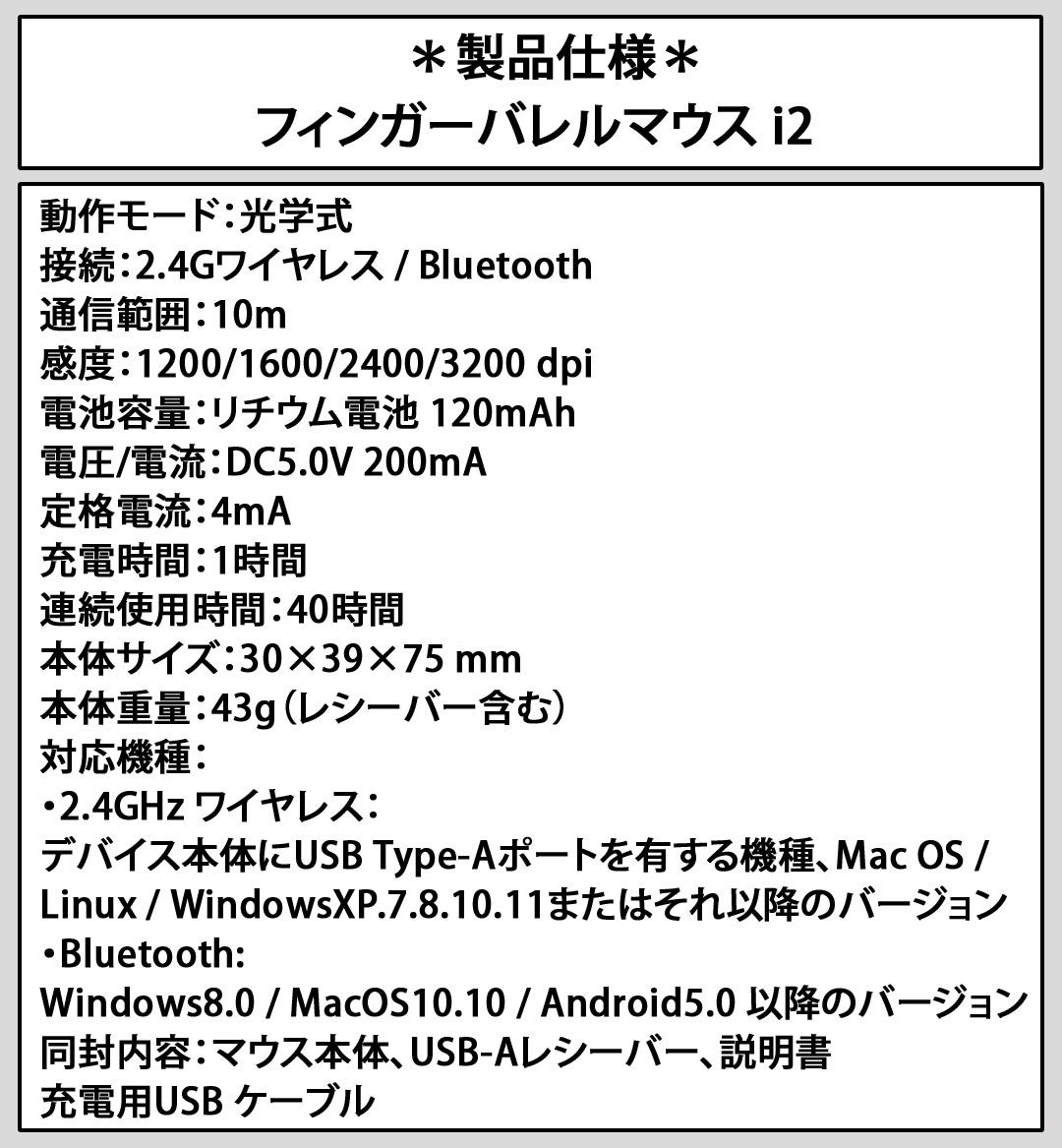 持った瞬間に感じる抜群のフィット感と操作性!小さい軽い使い易い!操作可動範囲も少なくノートパソコンの上だけで操作可能、クリック音も超静音!2.4GhzワイヤレスとBluetoothの無線規格に対応し、感度dpiも4段階設定できてレシーバーも本体に収納!手首、肩への負担も少ない疲れ知らずの、どこを取っても拘り抜いた「Finger Barrel Mouse i2」の改良版第二弾!