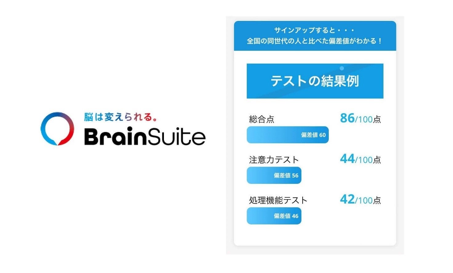 スマートフォンやタブレット端末などを通じて質問に答える3分間の簡易テストで、集中力や計算能力などに影響する「注意力」と、記憶力・判断力やストレス耐性などに影響する「処理機能」を測り、同姓・同世代と比較した結果を偏差値として示します。