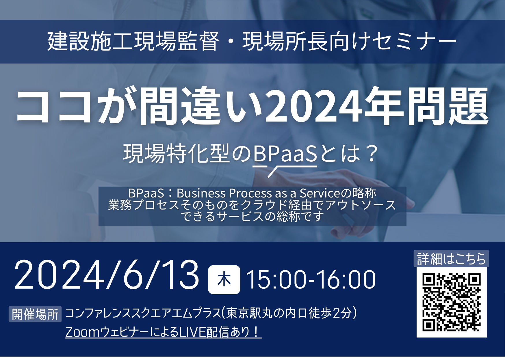建設施工現場監督・現場所長向けセミナー"ココが間違い2024年問題" 現場特化型の BPaaSとは?
