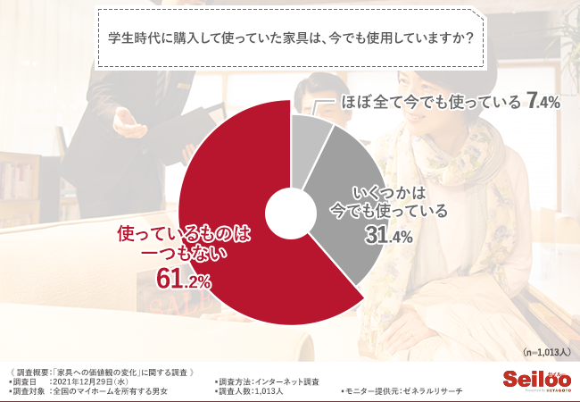 続いて、「学生時代に購入して使っていた家具は、今でも使用していますか?」と質問したところ、『使っているものは一つもない(61.2%)』と回答した方が最も多く、次いで『いくつかは今でも使っている(31.4%)』『ほぼ全て今でも使っている(7.4%)』と続きました。