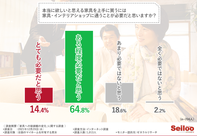 そこで、「本当に欲しいと思える家具を上手に買うには家具・インテリアショップに通うことが必要だと思いますか?」と質問したところ、7割以上の方が『とても必要だと思う(14.4%)』『ある程度必要だと思う(64.8%)』と回答しました。