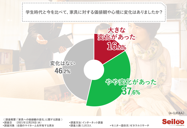 そこで、「学生時代と今を比べて、家具に対する価値観や心境に変化はありましたか?」と質問したところ、『大きな変化があった(16.2%)』『やや変化があった(37.6%)』『変化はない(46.2%)』という結果になりました。