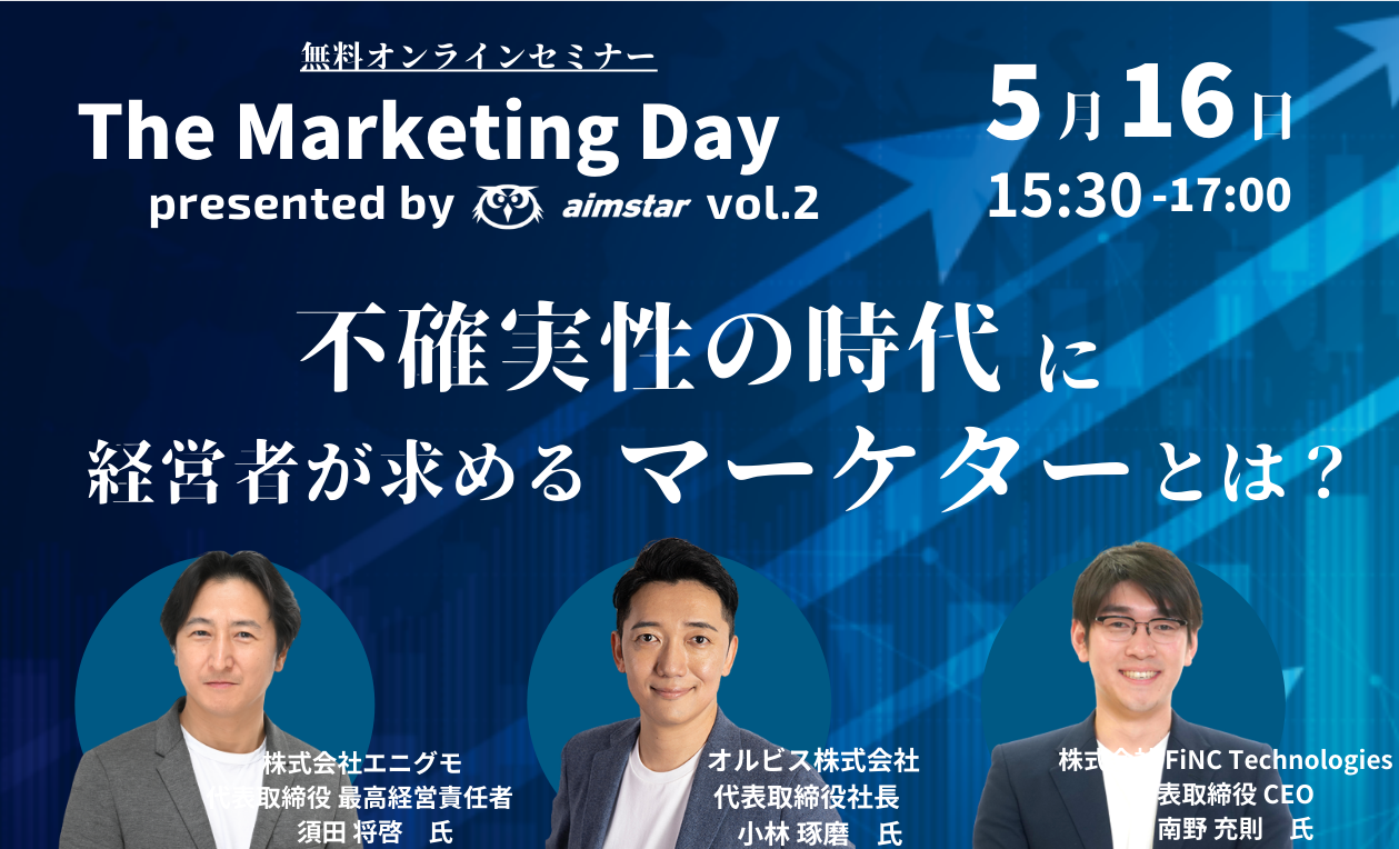 今回、2022年5月16日(月)に開催される弊社主催のオンラインセミナー「The Marketing Day presented by aimstar vol.2 ~不確実性の時代に経営者が求めるマーケターとは?~」に株式会社エニグモ・オルビス株式会社・株式会社FiNC Technologies の3社の代表が登壇します。