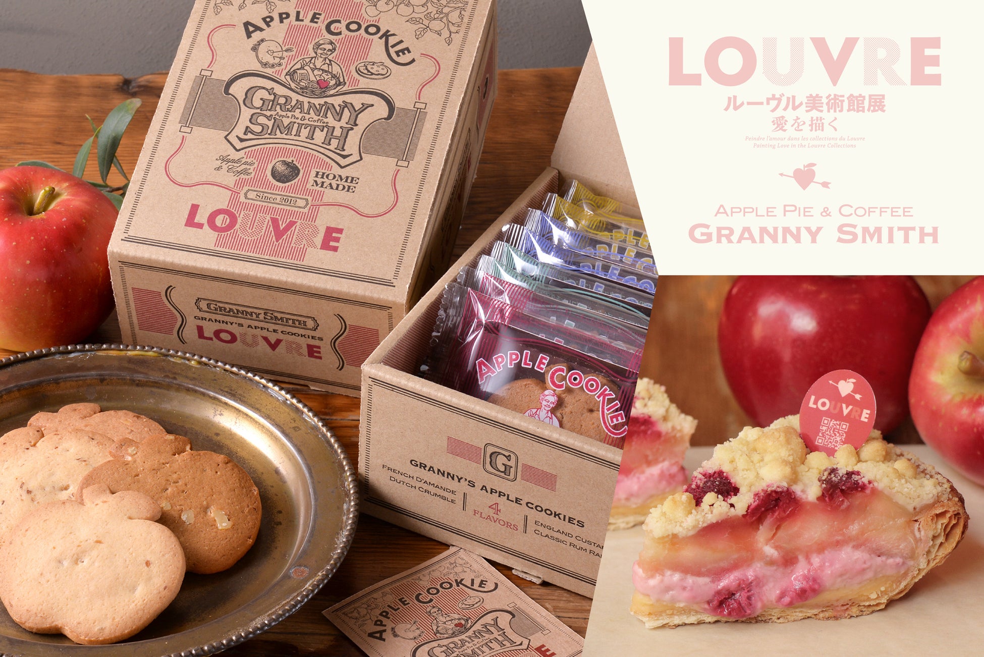 国立新美術館の展覧会場内特設ショップでは、コラボレーション限定デザインのボックスにグラニースミスのりんご入りクッキーを詰め合わせた『ラヴ・ルーヴル アップルクッキーボックス』を、展覧会がスタートする3月1日(水)から販売開始するほか、グラニースミス各店舗では、本展覧会の開催を記念した新商品『ラヴ・ルーヴル アップルパイ』を、同じく3月1日(水)より期間限定販売いたします。
