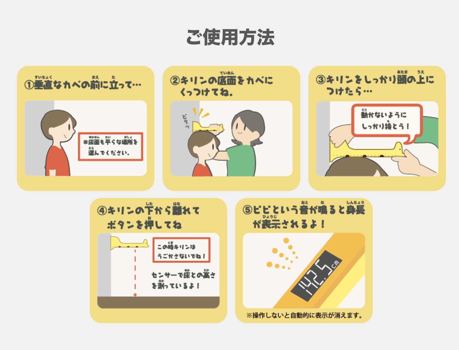 その場で頭に当ててじっとしていなくても床面との距離を音波センサーで計測できますので、育ち盛りの元気なお子様にもぴったり!日々の成長を楽しみながら測れます。