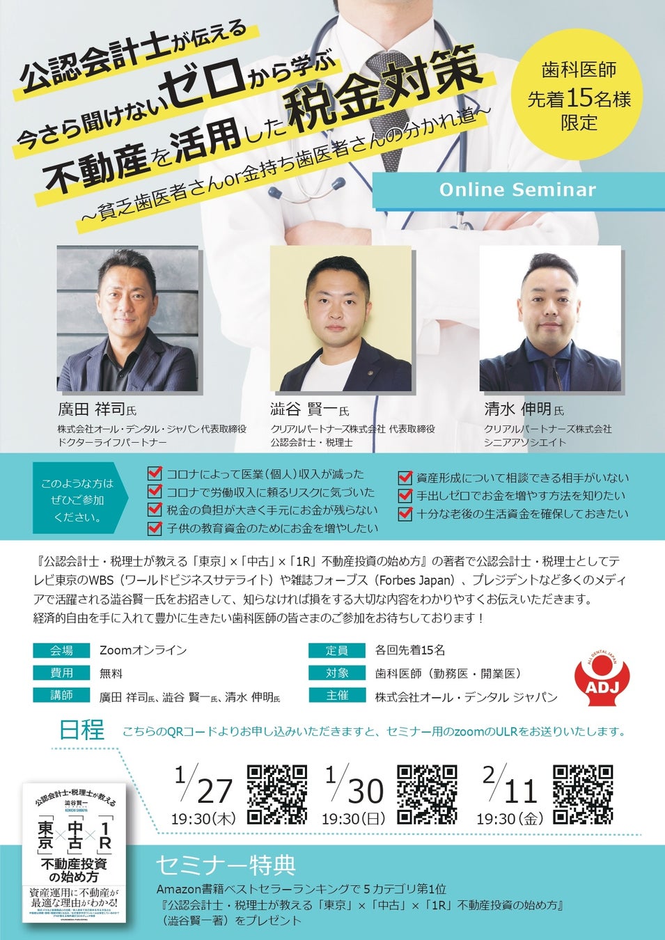 株式会社オール・デンタル・ジャパン(東京都台東区柳橋2-5-6)の協賛企業でもあるクリアルパートナーズ株式会社が、2022年1月27日(木)、1/30(日)、2/11(金)それぞれ19:30~ZOOMにて、不動産を活用した税金対策の無料セミナーを歯科医師限定で開催いたします。