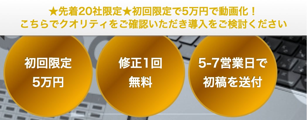 事業立ち上げに伴い現在キャンペーンを実施中です。初回の動画制作に関して、先着20社限定で尺60秒、ナレーションなしで5万円(税別)で承ります。お気軽にお問い合わせください。