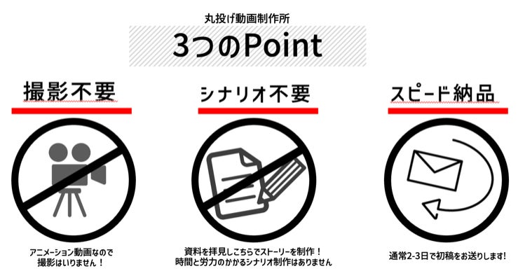 「丸投げ動画制作所」ではアフターコロナの企業と企業、人と人の間に出来た距離を動画コミュニケーションで解決します。テレワーク、オンラインミーティングが浸透して信頼感や親近感が以前より持ちにくくなった今、営業マンのキャラクターや親しみやすいアニメ動画を駆使してビジネスを円滑に進めることに寄与します。具体的には営業資料などの既存の資料などの素材を渡すのみ、「丸投げ動画制作所」のクリエイターが第三者視点でポイントを抽出し、ストーリー仕立てのアニメーション動画にして納品します。
