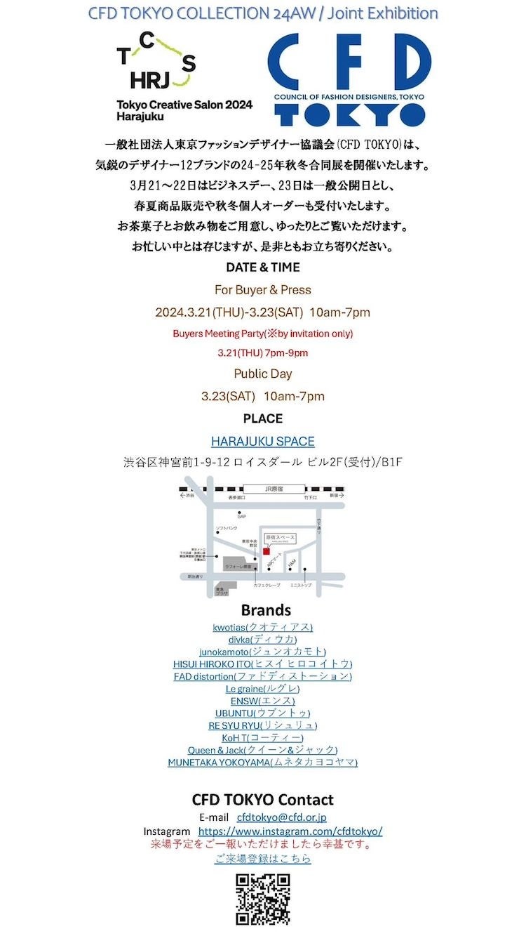 MILANO FASHION WEEK(ミラノコレクション)で披露したアイテムは、RAKUTEN FASHION WEEK TOKYO中のイベントで、2024年3月21日(木)から23日(土)にかけて開催される一般社団法人東京ファッションデザイナー協議会(CFD TOKYO)主催の『CFD TOKYO COLLECTION』で観ることが出来ます。