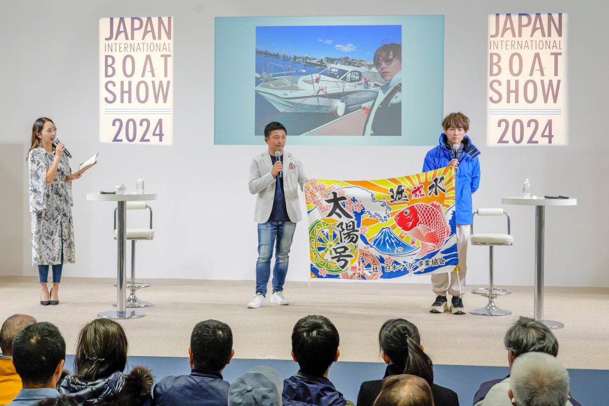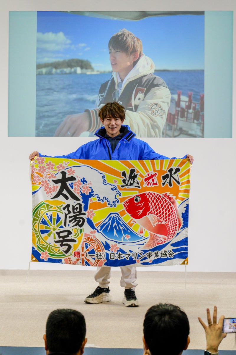 トークショーの途中、サプライズで日本マリン事業協会ジェネラルアドバイザーの東原邦明より進水祝いの大漁旗を贈呈。杉浦は驚きつつも「進水式はこれからなので、ぜひこの大漁旗を使って行いたい」と嬉しそうに意気込みを語った。