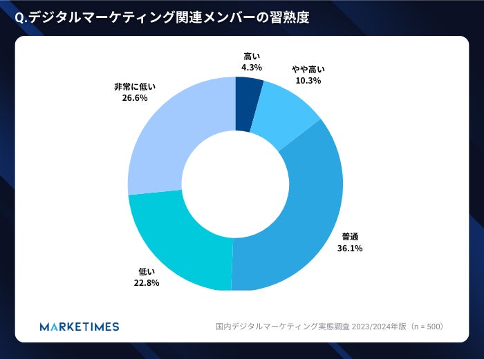 部門メンバーの習熟度に関して、高いと回答したのはわずか4.29%、やや高いが10.30%です。この結果は、デジタルマーケティングの専門知識がまだ十分には浸透していない現状を示しています。多くが「普通」(36.05%)と回答し、低いまたは非常に低いとする回答が合わせて約49%となっています。デジタルマーケティングスキルの向上が多くの企業において課題であることを示唆しています。