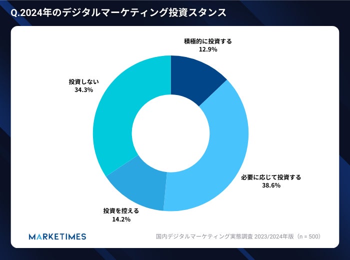 【2024年のデジタルマーケティングへの投資スタンス:12.9%が「積極的に投資する」と回答し、38.6%が「必要に応じて投資する」】