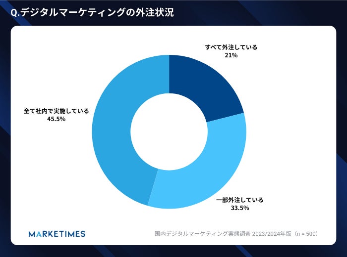 【デジタルマーケティング外注状況:全てを外注する企業が21%、一部外注が33.5%】