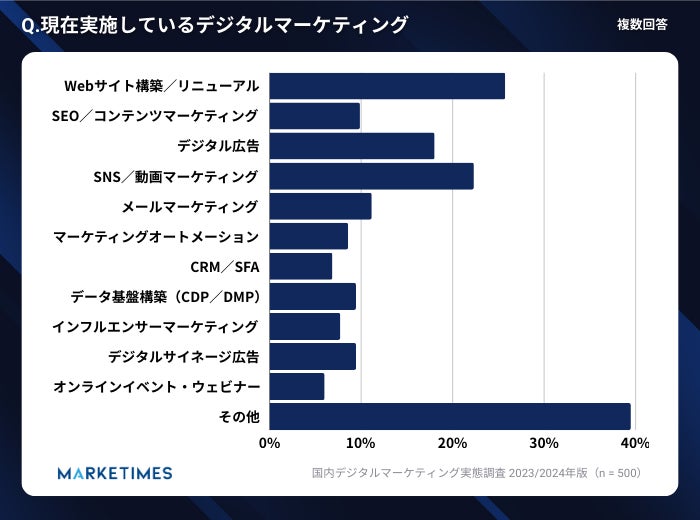 【2023年現在実施しているデジタルマーケティング手法:「Webサイト構築/リニューアル」が25.8%最多、続いて「SNS/動画マーケティング」が22.3%、「デジタル広告」が18%】
