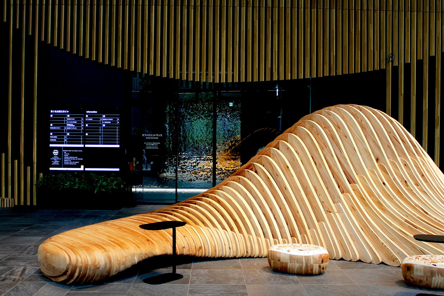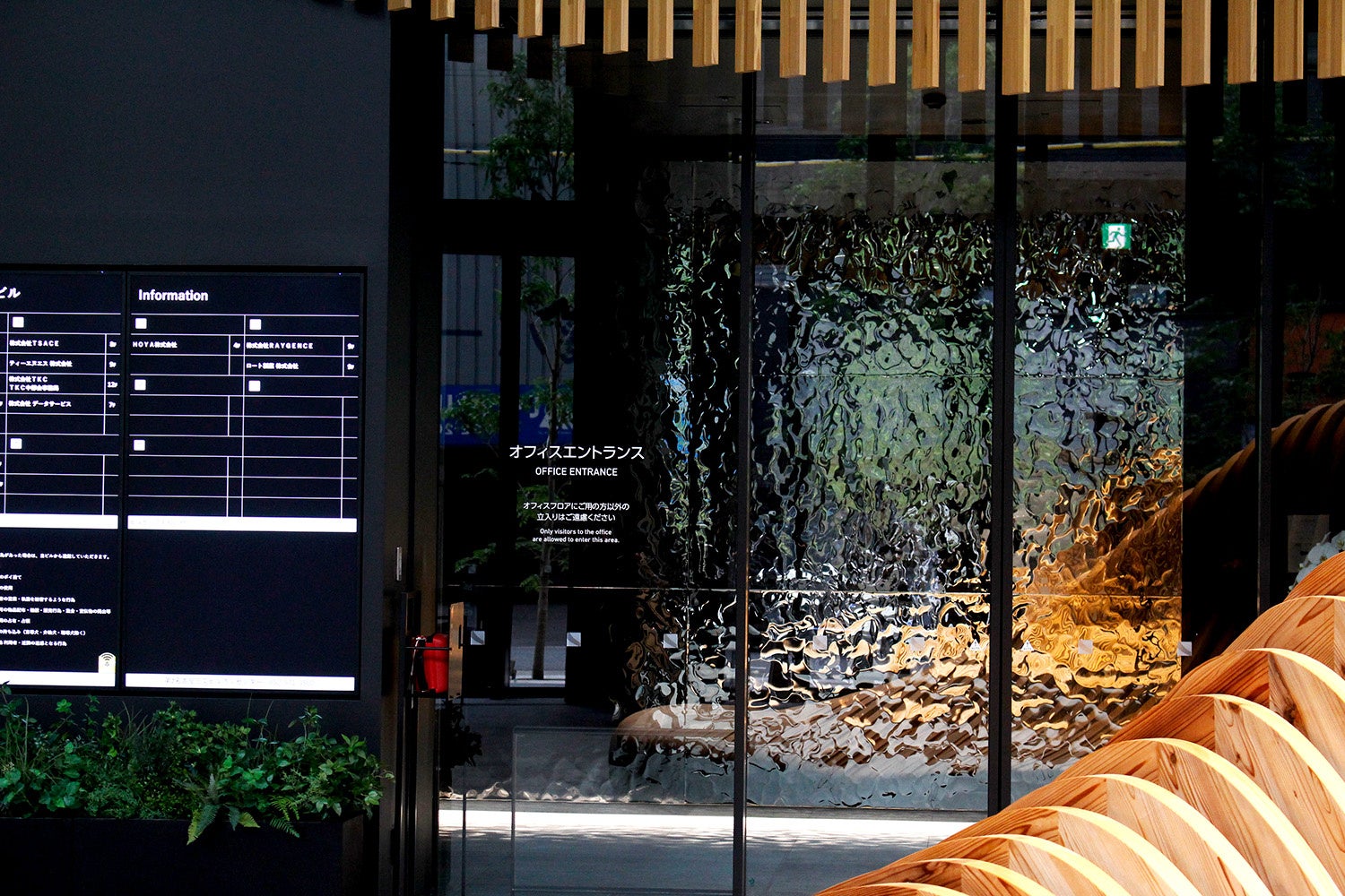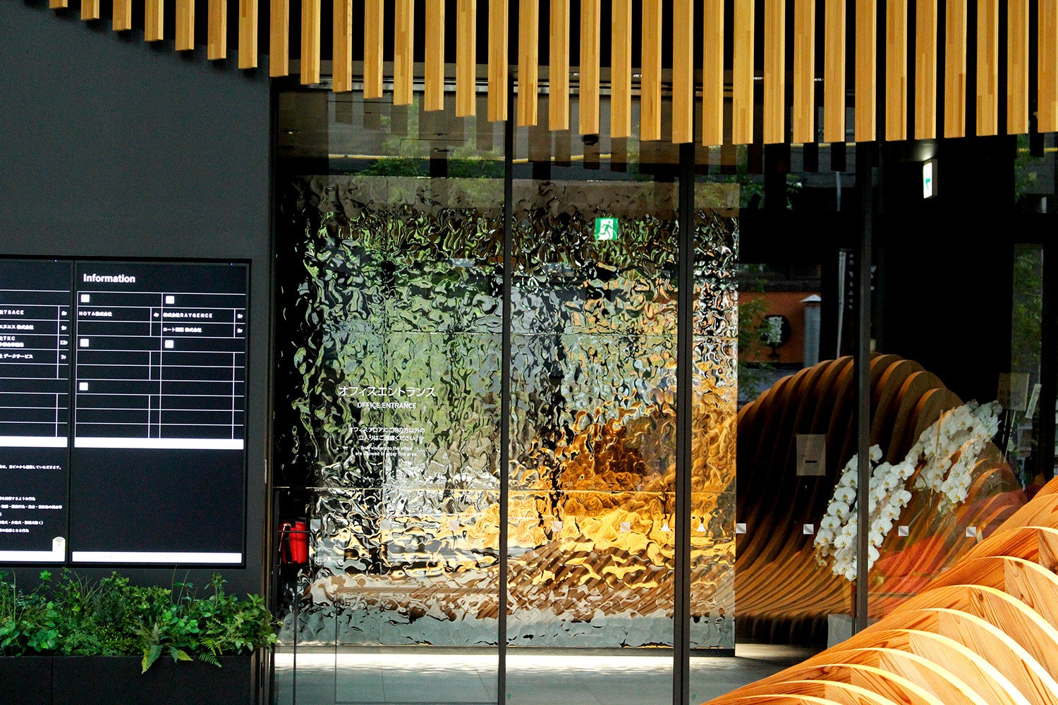 採用箇所:公共エントランスとオフィスフロアへの連絡通路壁面