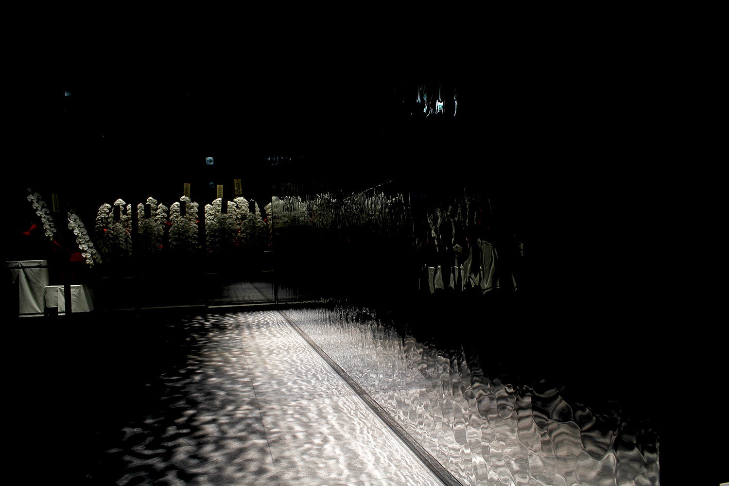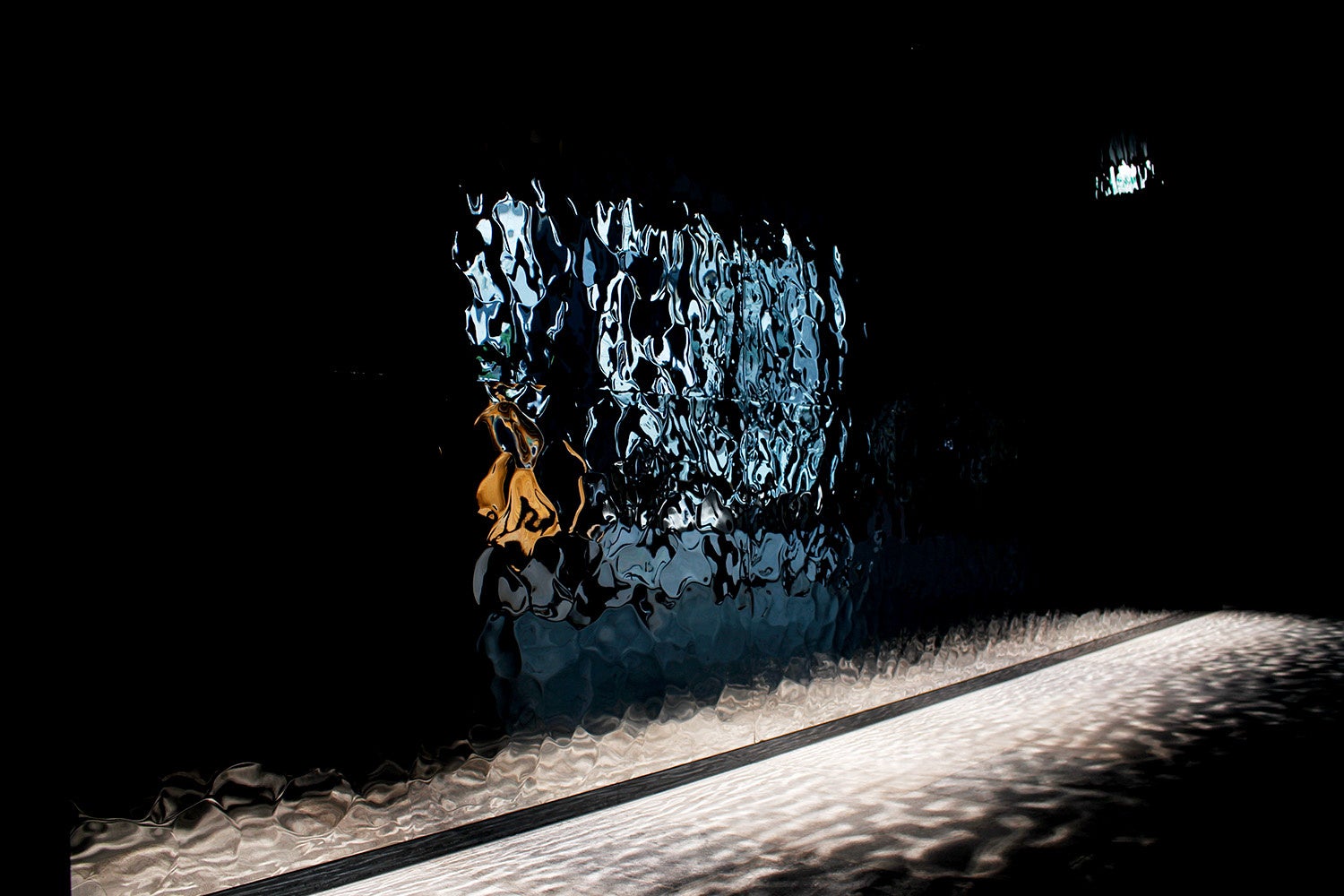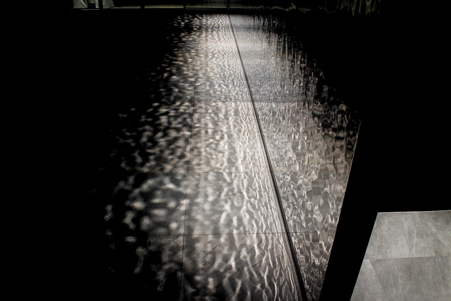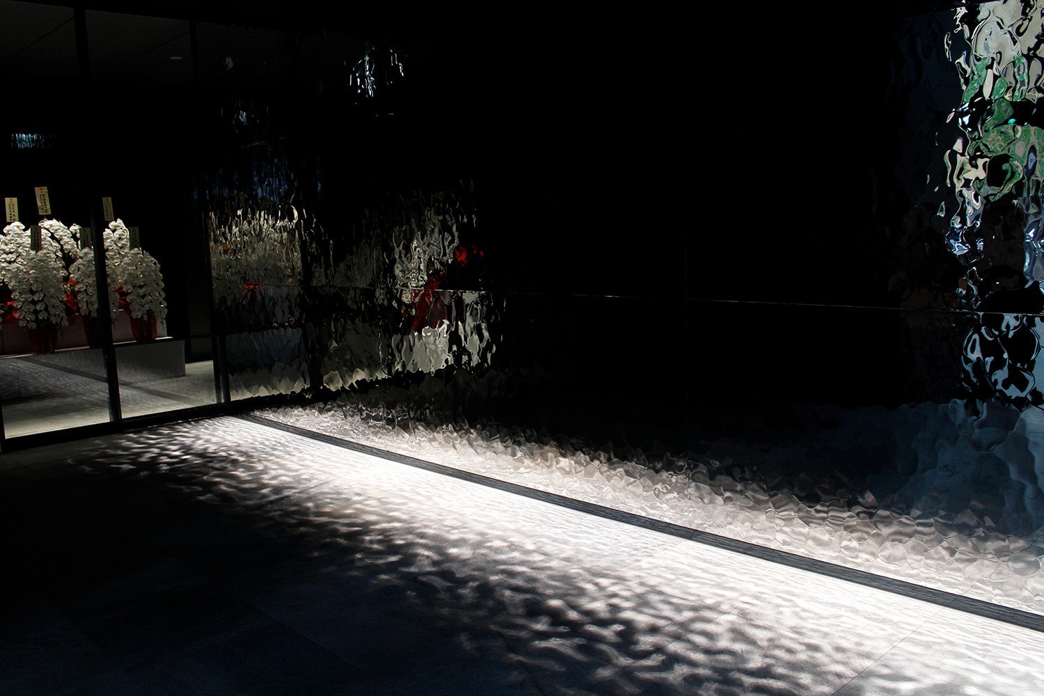 本プロジェクトでは、東洋ステンレス研磨工業の特注仕様「ミステリアスミラー®リップルス」が用いられ、通路壁面に三種類のパネルが施されました。これらのパネルは、テクスチャーの変化とともに光の反射が異なり、見る角度によって異なる印象を与えることで、通路を進む度に新たな発見と感動を提供します。特に、光が巧みに計算された角度で反射し、床面タイルに美しく散りばめられた光が投影される様は、訪れる者を非日常的な世界へ誘います。