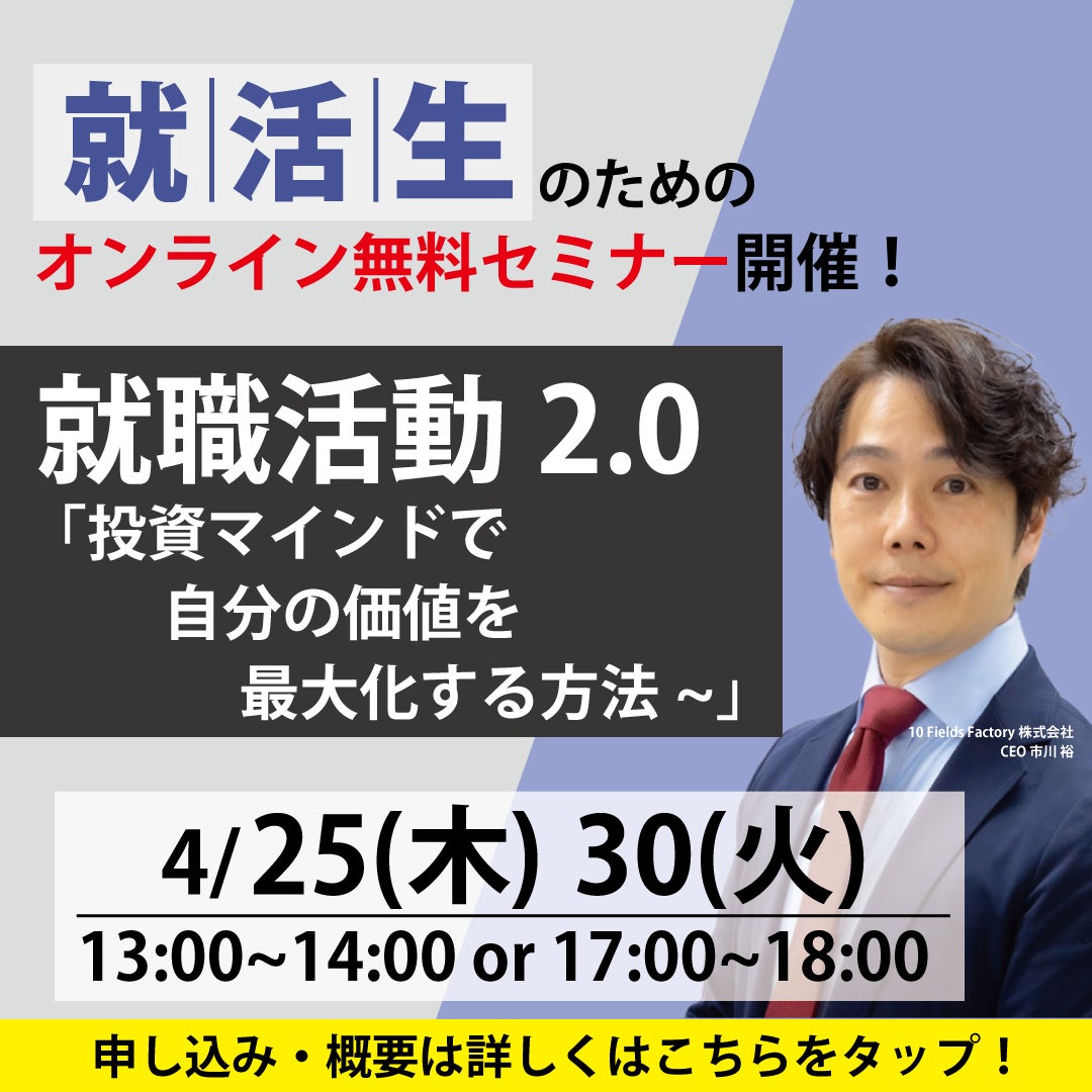 4/25(木)と4/30(火)開催!就職を単なる「仕事を見つける活動」ではなく、「人生における最大の投資」として捉える方法を探ります。