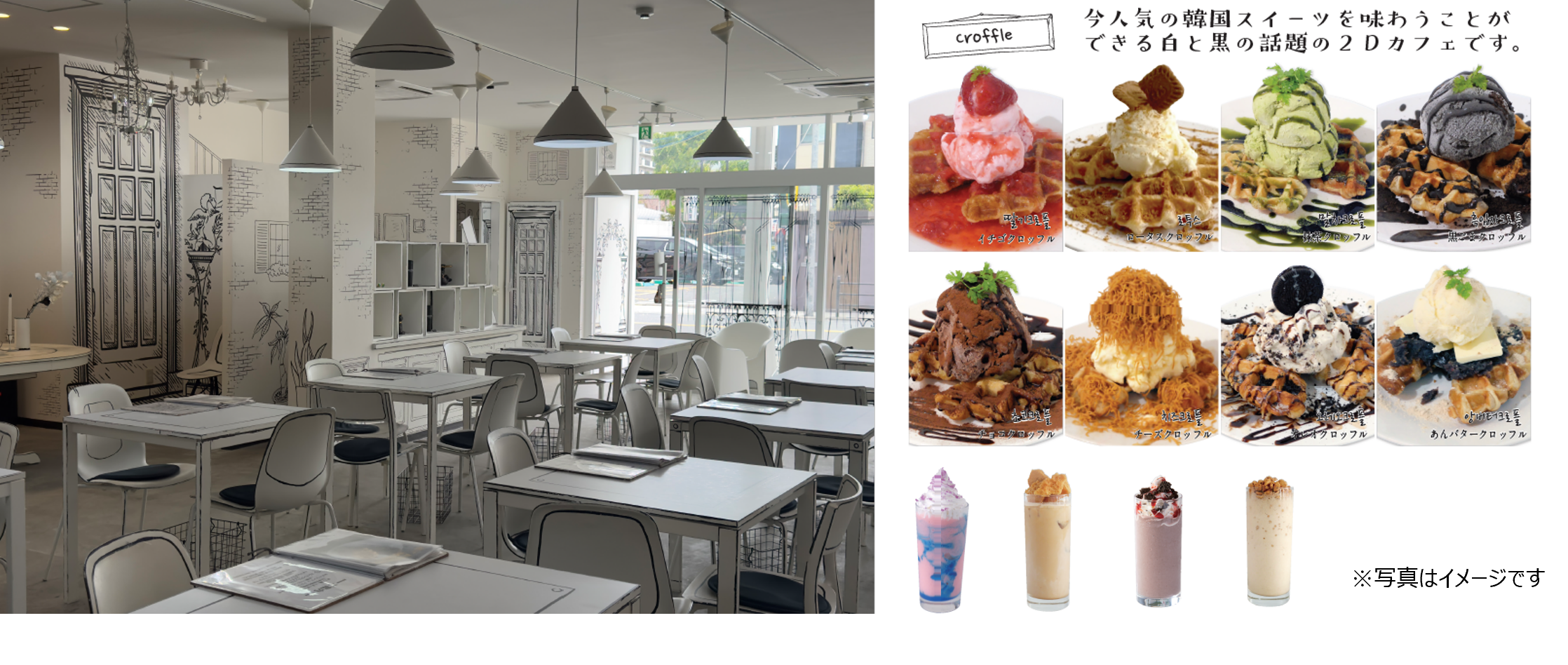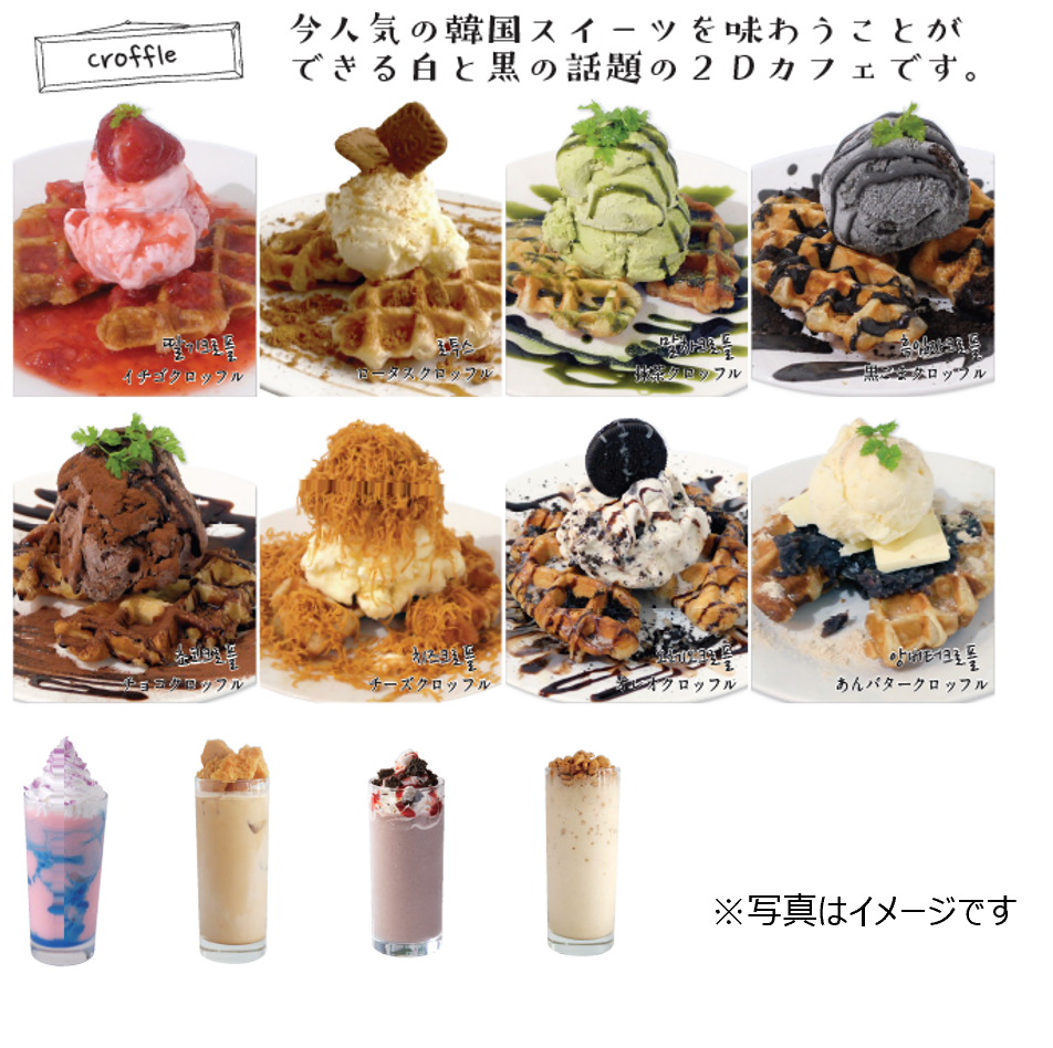 大阪・梅田のヨドバシカメラと一体となった複合商業施設「LINKS UMEDA(リンクス梅田)」(大阪市北区大深町)の1階に大阪鶴橋コリアンタウンで人気の2Dカフェ 「In The Cartoon(インザカートゥーン)」が4月28日(日)にオープンします。「In The Cartoon」 は、白と黒を基調とした内装で、まるで絵本の世界に入っているような独特な空間を楽しみながら、今人気の韓国スイーツを味わうことができる話題の2Dカフェです。鶴橋コリアタウンの入り口の方に位置している本店は「アンニョンハセヨー」と韓国語で挨拶するスタッフたちとKPOPが流れる店内がお客様をお出迎え、韓国語メニューが用意されており、まるで韓国旅行に来た気分にさせてくれます。その本格韓国カフェの雰囲気を大阪梅田のLINKS UMEDA でも味わえることになりました。 「In The Cartoon」では季節に合った自然な色などをコンセプトにし、毎月限定メニューを開発しています。綺麗なグラデーションで見るだけでテンションが上がる飲み物、韓国で話題になったクロワッサンとワッフルのコラボレーション「クロッフル」は定番の人気メニューです。また、LINKS UMEDAでしか食べられない限定メニューもございます。3次元なのにまるで2次元に見える店内で、カラフルなドリンクやスイーツがコントラストとなり写真映えする事間違いなし、是非、この独特な世界に足を踏み入れてみてはいかがでしょうか。