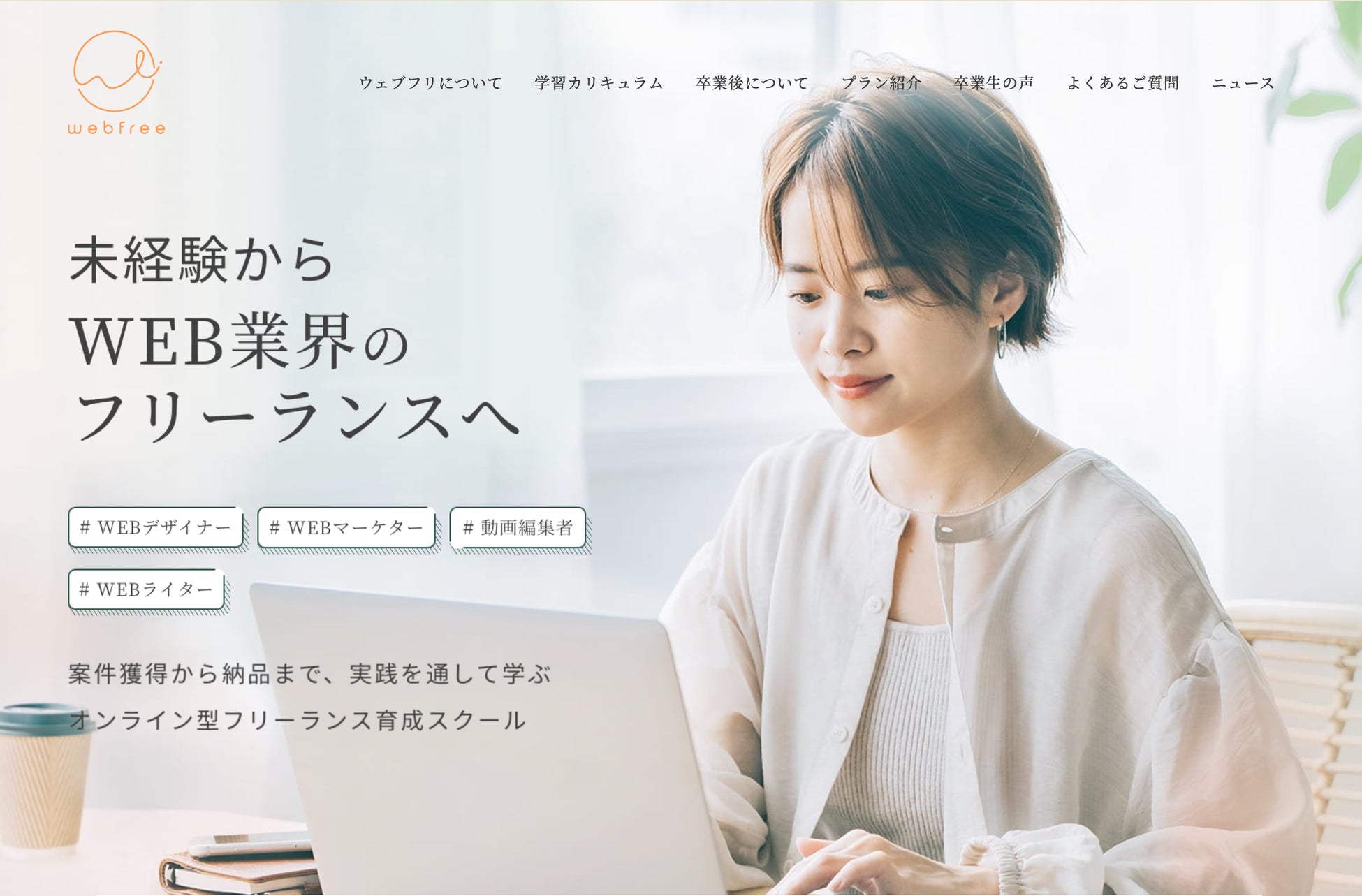 『webfree(ウェブフリ)』は受講中から収益化できるフリーランス育成スクールです。座学やスキルの習得だけでなく、全てのカリキュラムに案件獲得期間が含まれています。現役フリーランスコーチのマンツーマンサポートが受けられるため、受講中から経験を積むことが可能です。Web業界未経験からでも副業で収入を得たり、稼げるフリーランスとして卒業することを目的としています。
