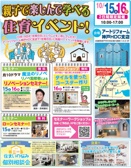 全国でリフォーム・リノベーション工事を年間6,500件以上手がける株式会社アートリフォーム(本社:大阪府吹田市、代表者:代表取締役社長 大本哲也、以下「アートリフォーム」)は、オフラインイベント『親子で楽しんで学べる住育イベント』を2022年10月15日(土)~16日(日)に、旗艦店舗である神戸HDC支店にて開催いたします。
