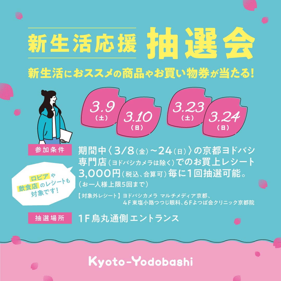 2024年3月8日(金)~3月24日(日)の期間中の京都ヨドバシ専門店お買上げレシート3,000円(税込/合算可)毎に1回(お一人様上限5回まで)、新生活におススメの商品や京都ヨドバシ専門店 お買物・お食事券が当たる抽選会に参加いただけます。