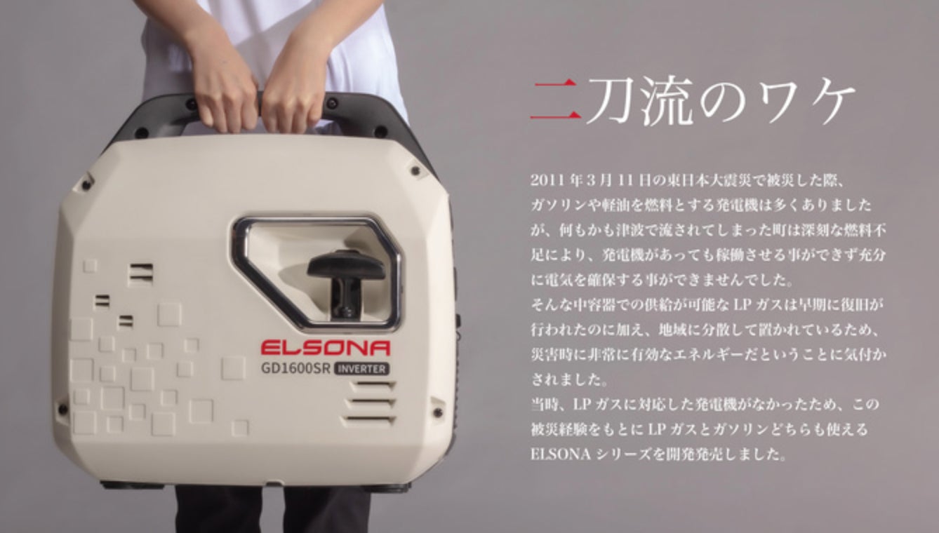容器での供給が可能なL Pガスは早急に復旧が行われた(※)ことに加え、地域に分散しておかれており、災害時に非常に有効なエネルギーでしたが、当時はLPガスに対応した発電機は存在しませんでした。そこから被災地であった岩手県大槌町で開発がすすめられ、LPガスとガソリン2つの燃料が使える二刀流発電機ELSONA(エルソナ)が生まれました。