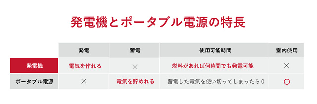 『発電機』と『ポータブル電源』はそれぞれ強みが違います。『ポータブル電源』は動作音もほとんどなく、室内で使用できますが、使える電気の容量に制約があり、残量が0になってしまうと充電する必要があります。一方、『発電機』は 燃料があればいくらでも電気をつくることはできますが、使用電力が小さいと発電した電気を全て使いきれない場合もあり、室内で使用できないといった制約もあります。