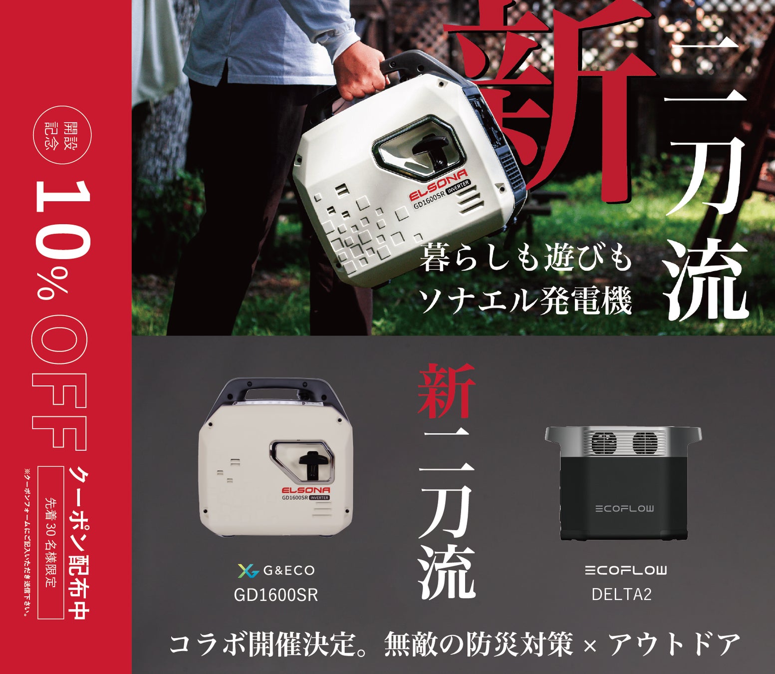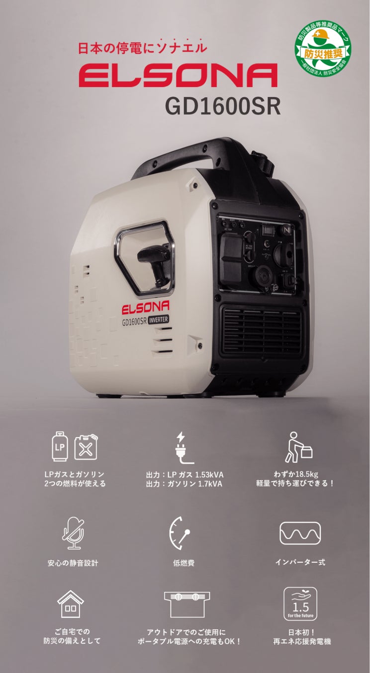 株式会社G&ECO(本社:東京都中央区、代表取締役社長:小島 盛利)は応援購入サービスMakuakeで先行発売した話題のLPガス&ガソリン新・二刀流発電機 “ ELSONA GD1600SR ”の公式ECサイトをオープンし、12/23より一般販売を開始いたしました。最新のEcoFlowポータブル電源【DELTA2】とのコラボ販売もあり、『発電機』と『蓄電池』の強みを活かした運用が可能です。