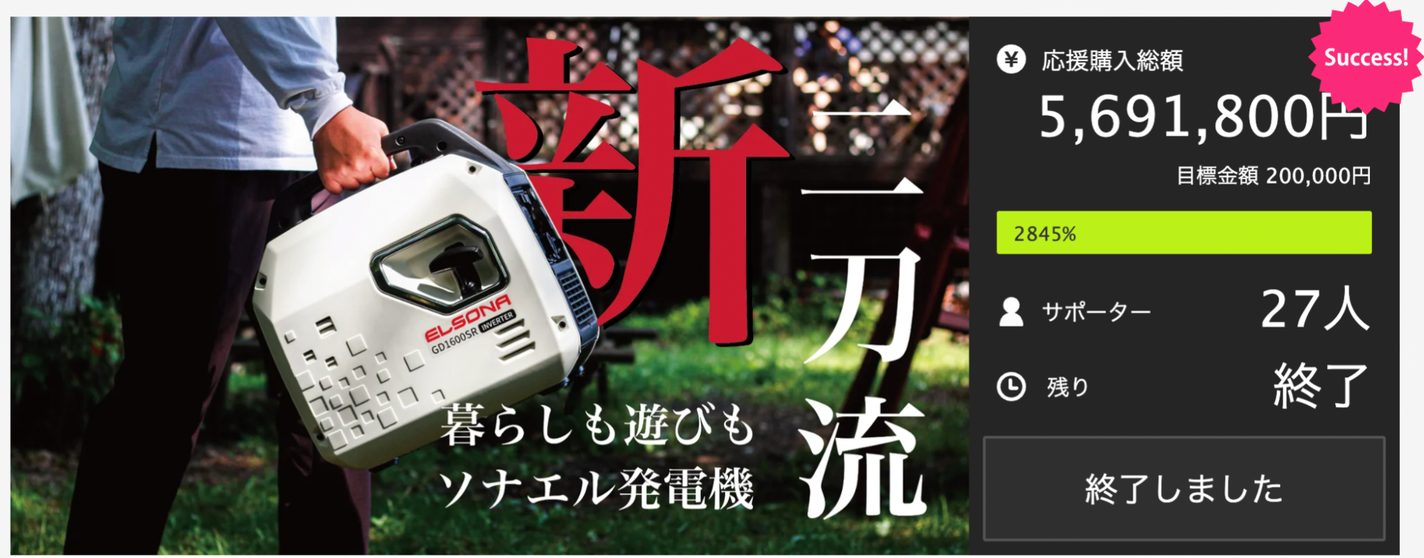 “ ELSONA GD1600SR ” は9/2に先行販売を行った応援購入サービスMakuakeでは発売後3分で目標達成、“ GD1600SR ”の「超早割」「超MAX早割」に関しては発売後2日で完売となった話題のポータブル発電機です。