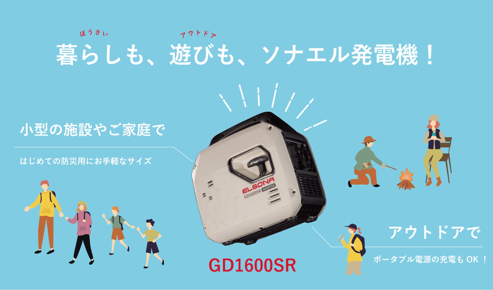 - 「暮らし(ぼうさい)」も「遊び(アウトドア)」もソナエル発電機!