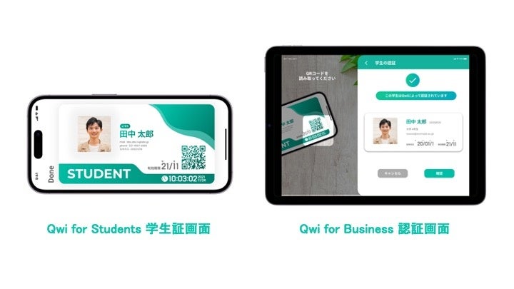 Qwiが提供する学生認証は、学生のユーザーが利用する電子学生証アプリの"Qwi for Students"と、店舗側が設置するアプリの"Qwi for Business"の2つを用いて行われます。