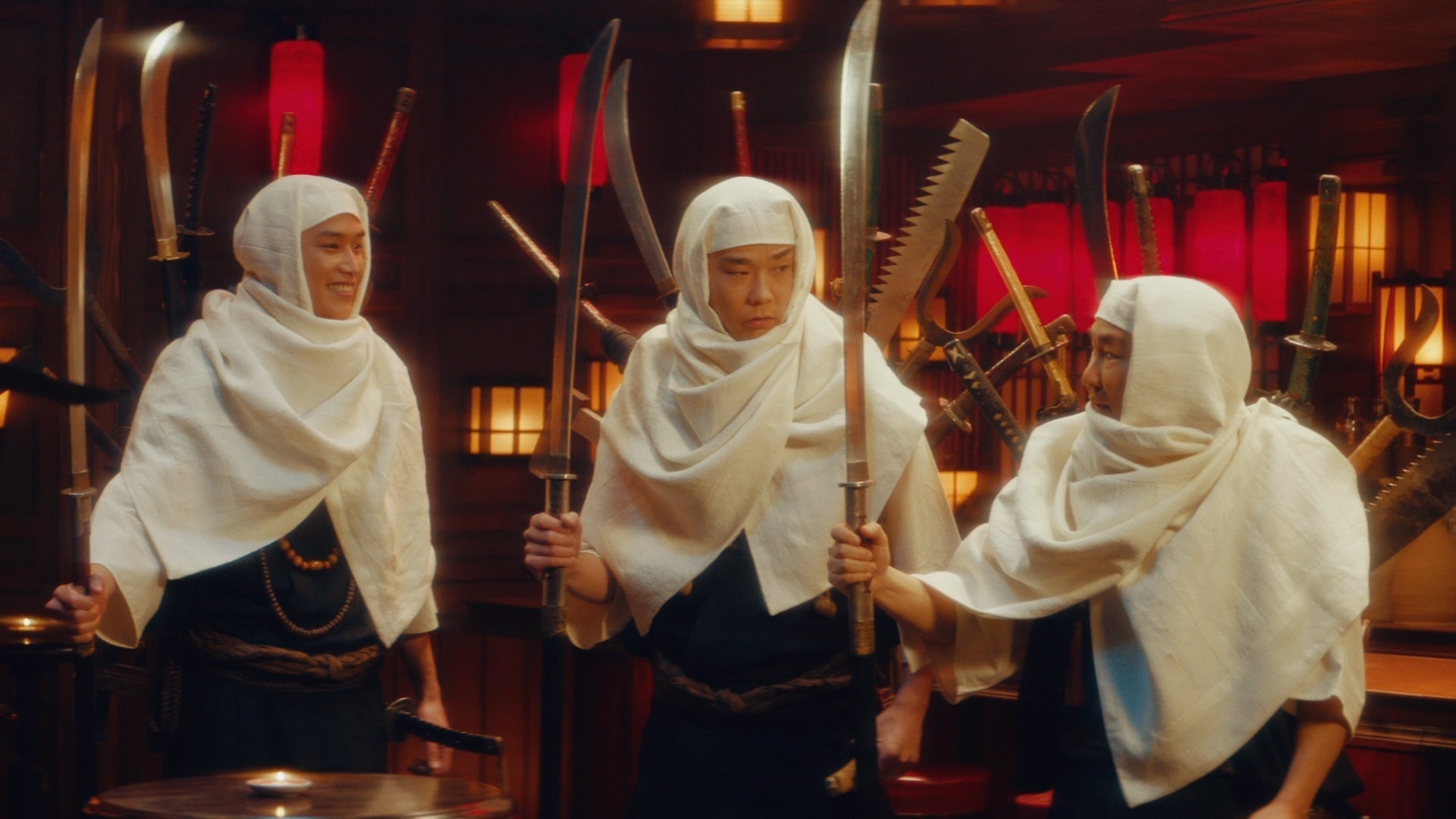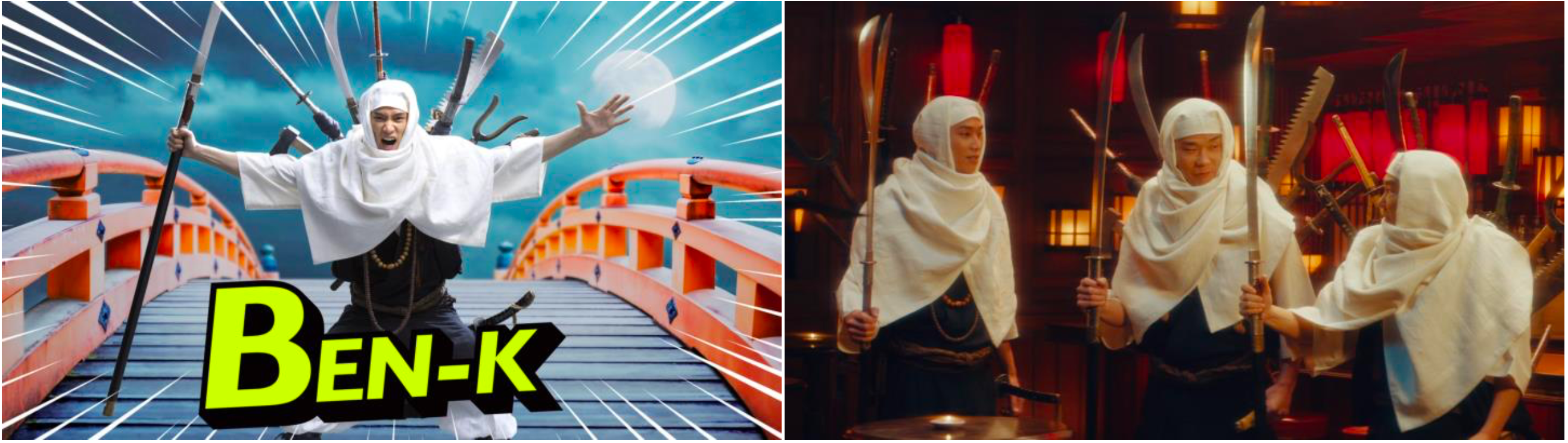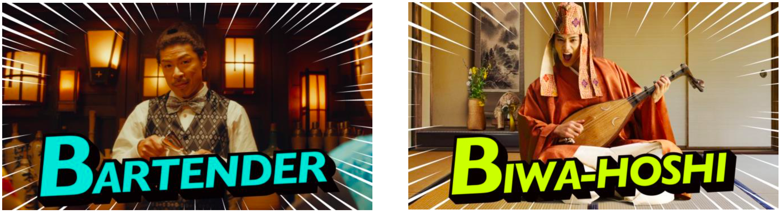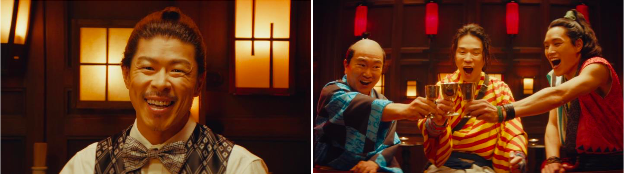 CMの最後には、3人が弁慶の格好で登場し、「これ大丈夫?」と不安そうにバーテンダーに問いかけると「モテますね!」とやはり自信 満々に答えて締め括られます。