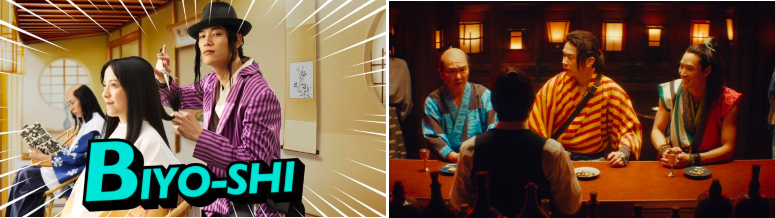 鈴木さん:僕は琵琶法師と美容師に扮装させてもらったんですけども、(CM設定上)時代も遡った美容師、琵琶法師の役柄だったので、 ハサミとかも昔ながらのサビついた感じで一個一個のアイテムが古くてそれがちょっと面白かったなと思うのと、なかなか琵琶法師の格好するこ とももうないんじゃないかなと思ってすごくありがたい経験だったなと思います。