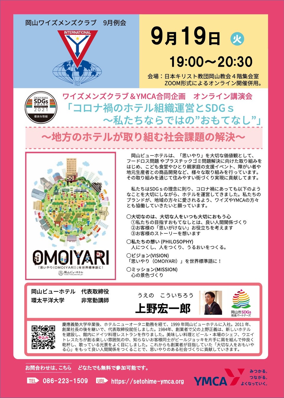 岡山ワイズメンズクラブ&YMCAせとうち合同企画 オンライン&リアル講演会 「コロナ禍のホテル組織運営とSDGs〜私たちならではの”おもてなし”」