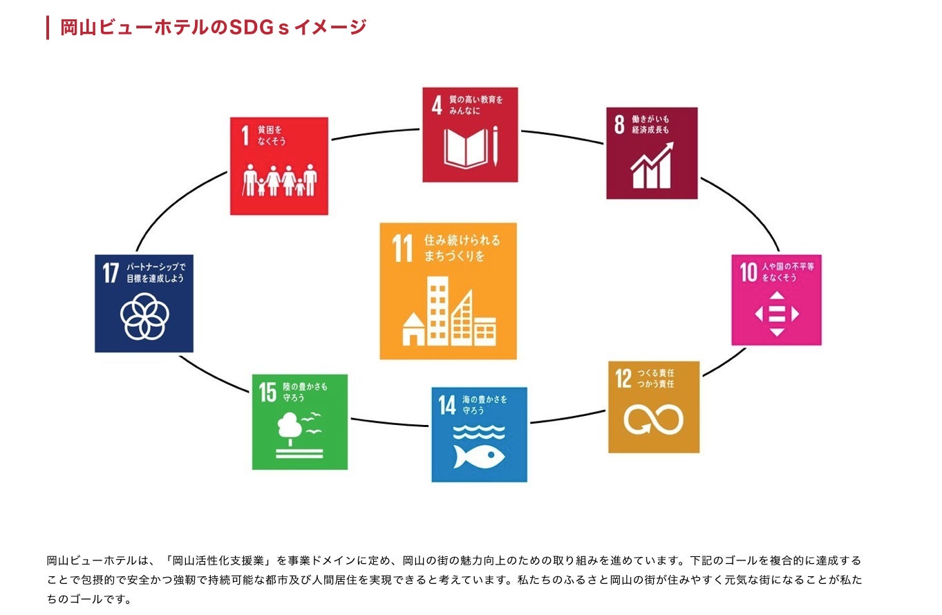 岡山ビューホテルは「思いやり」を大切な価値観として、フードロス問題 やプラスチックゴミ問題解決に向けた取り組みをはじめ、こども食堂やひとり親家庭支援イベント、障がい者や地元生産者との商品開発など、様々な取り組みを行っています。その取り組みを通じて住みやすい街づくり実現に貢献してます。