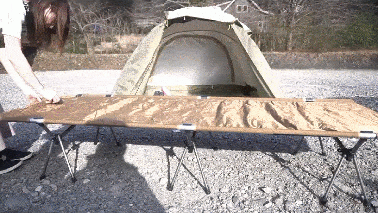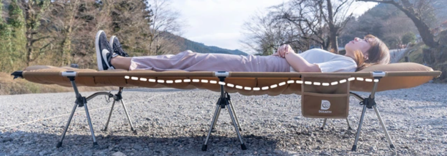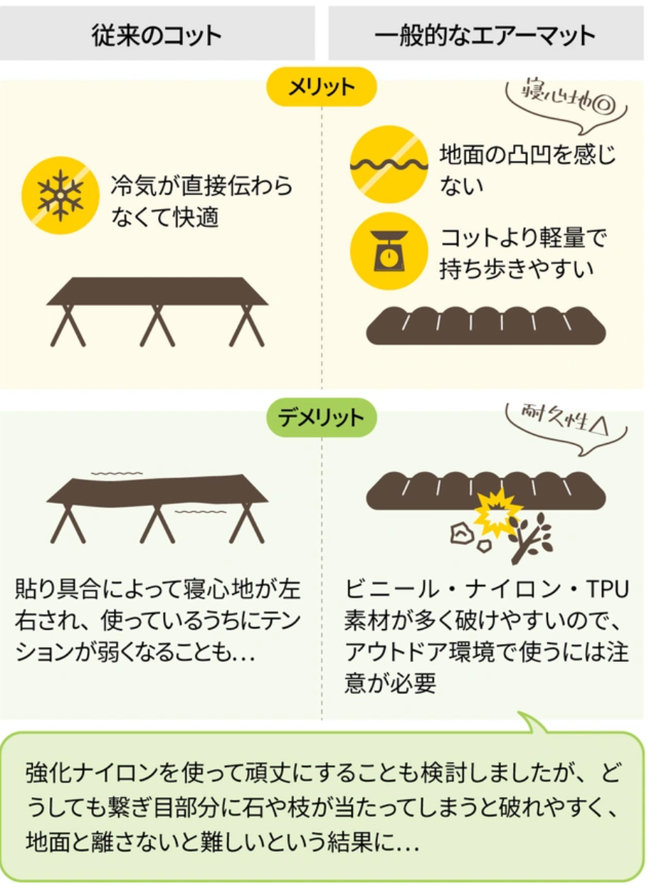 従来のコットは地面に直接触れない快適さがある反面、張り具合で寝心地が変わったり、ギシギシと軋む音で起きてしまい不満がありました。
