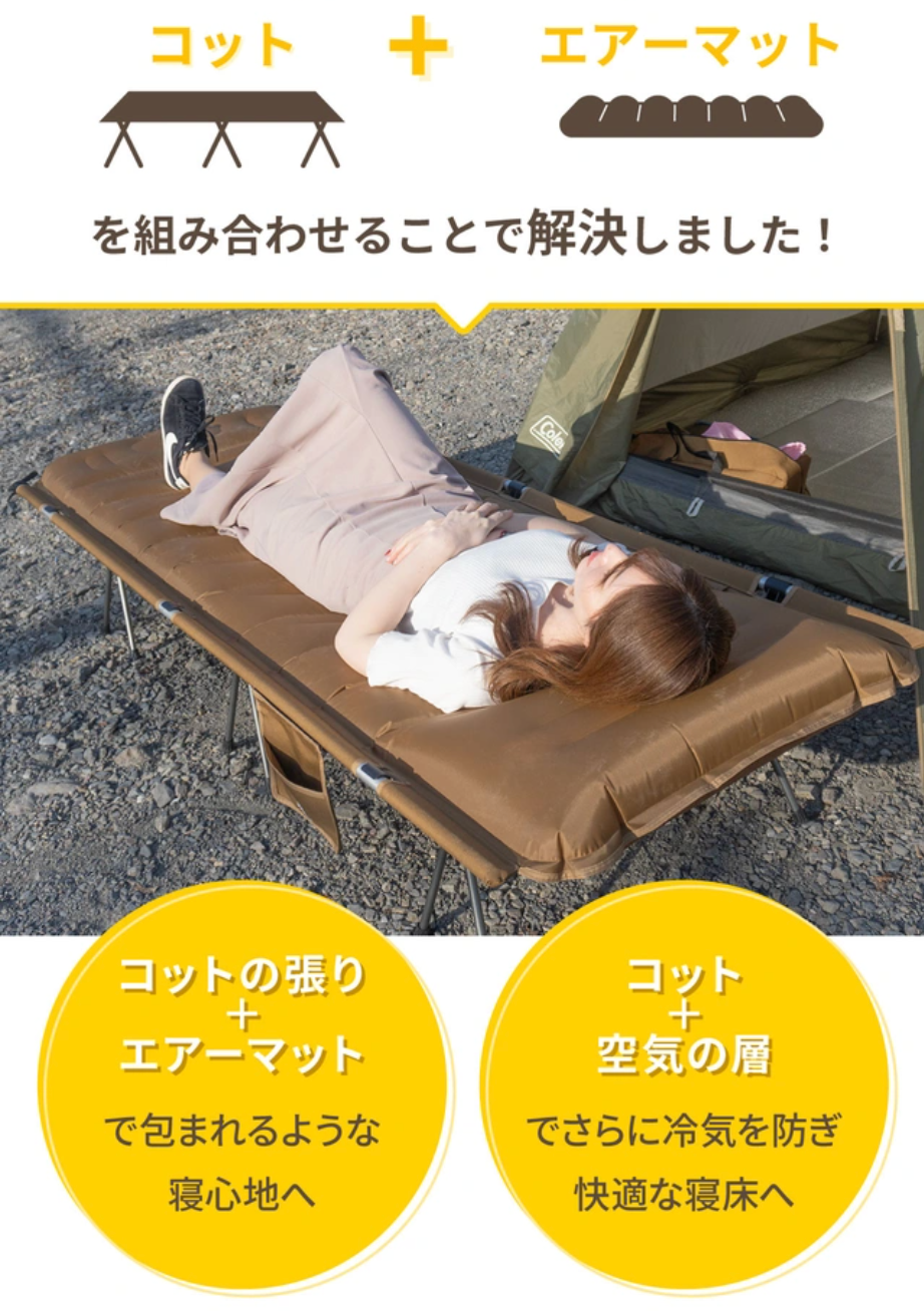 エアーマットだけでも成しえない、コットだけでも成しえない2段構造になっているからこその沈み込みで、寝転んだ瞬間にわかる心地よさを実現しました!