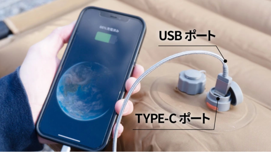 Gussuriでは膨らませる為のバッテリー(5V/1A)が内蔵されており、USBポートがついているので寝ながらでもスマホやモバイル機器を充電することができます。