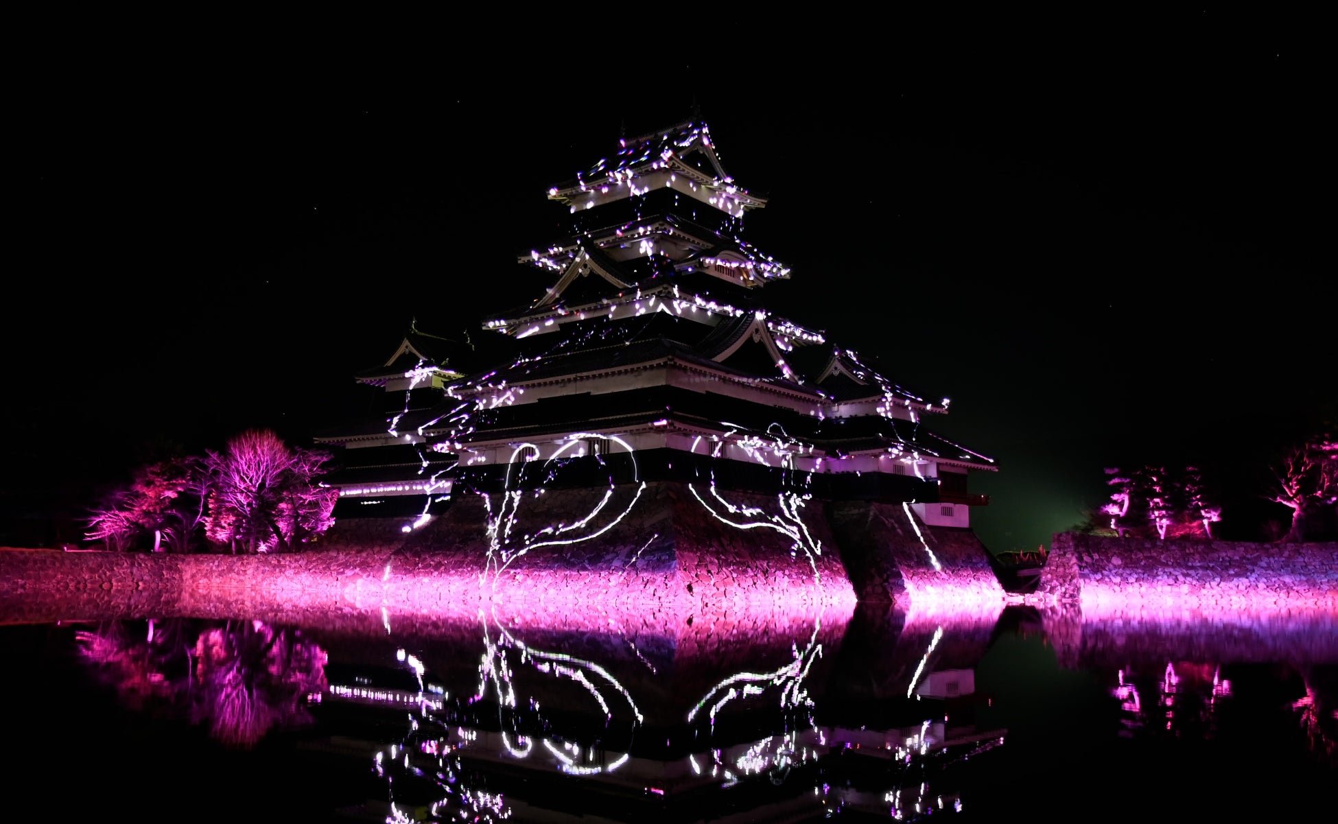 カラフルな想いが溢れ出し、バレンタインにちなんだハートのラインを描きます。いつもの松本城とはまた違った景色をお楽しみください。