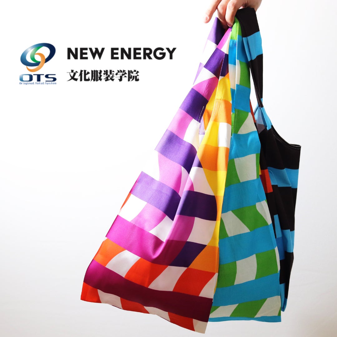 2022 年 9 月の NEW ENERGY TOKYO 開催にて、OTS 社が製作した空間装飾用プリント地。通常、会期後には破棄される事の多い装飾資材を、再利用する為のプロジェクトを、OTS社と文化服装学院がタッグを組み実現。エコバックとしてアップサイクルされた限定アイテムを、会期中1万円以上のお買い上げ頂いた方先着 200名様にプレゼントいたします。会場内インフォメーションにて「物販伝票のお客様控え」をお持ち下さい。エコバック引換券を発行させて頂きます。 ※予定数を超えた時点で、本サービスは終了とさせて頂きます。