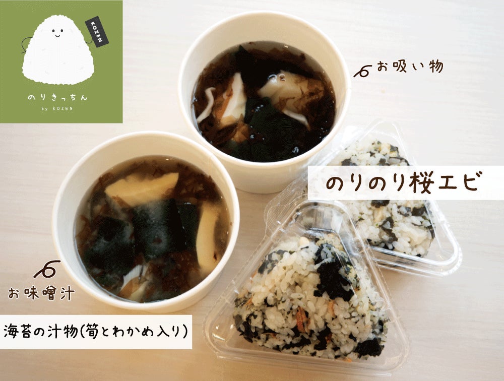 直営店「のりきっちんby KOZEN」にて、4月1日に【のりのり桜エビおにぎり】【鰆の西京焼おにぎり】と【海苔の汁物(筍とわかめ入り)】を販売いたします。