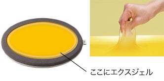 「エクスジェル」は、手でつかむとおもちのように伸びる柔軟性のあるジェル素材。ただ柔らかいだけではなく弾力性にも優れ、身体を安定して支持します。低反発でも、高反発でもない、全く新しい素材「エクスジェル」は、ゴルフボールを落としても全く弾むことなく力を吸収します。