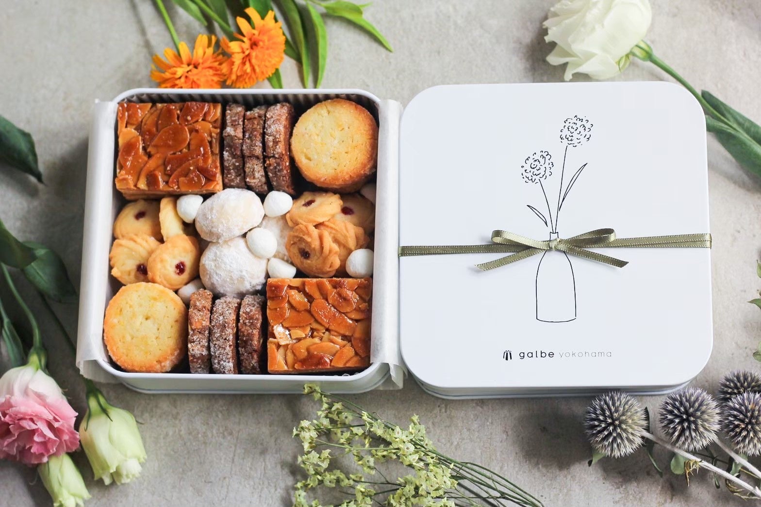 お使い物に最適な、galbeのイチ推しカヌレ5種類が詰まった定番カヌレBOXや、自分用・贈り物問わず人気のクッキー缶など、詰め合わせのご用意もあります。