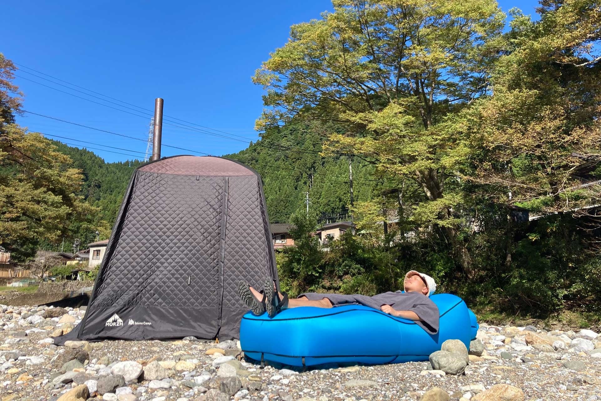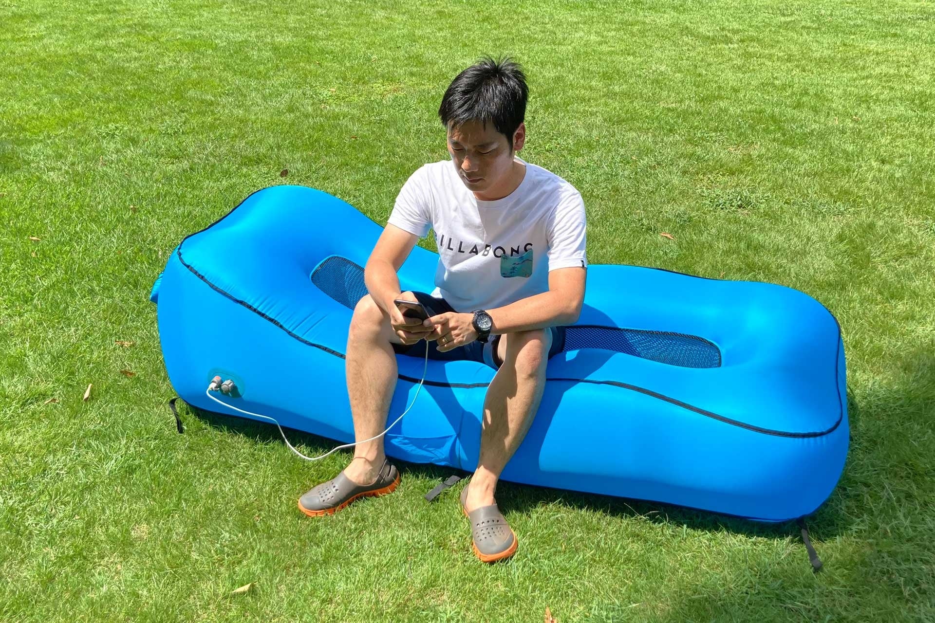ボタン一つで自動的に膨らみ、約60秒で簡単に完成する簡易ソファーです。素材にはTPRコーティング加工を施しているため、水や汚れに強く耐久性に優れています。キャンプやピクニックなどのアウトドアシーンをはじめ、サウナ後のととのい時間や災害時における防災グッズなど様々なシーンでご利用いただけます。