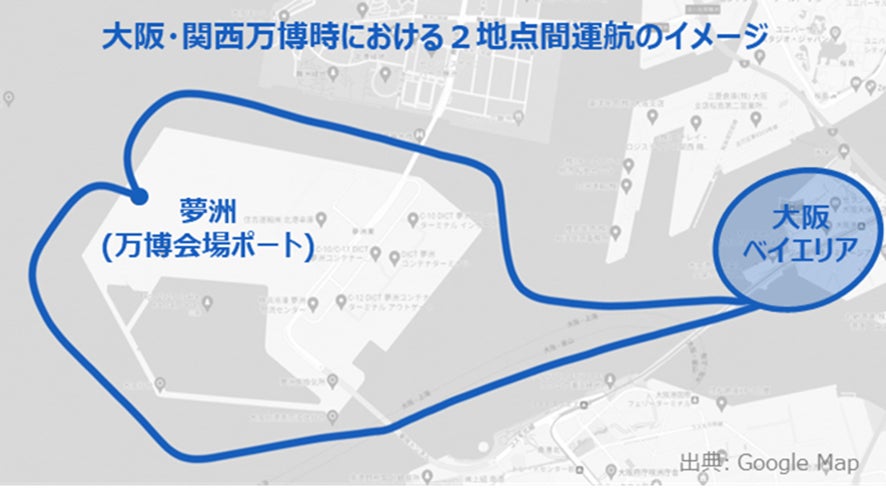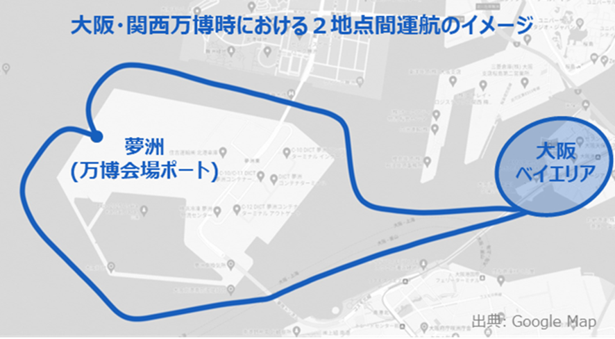 ① 大阪・関西万博時の2地点間運航実現に向け、大阪ベイエリアの離着陸ポート候補地について、必要となるインフラや飛行航路の検証を行う。