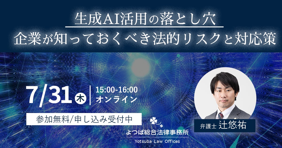 よつば総合法律事務所(本店所在地:千葉県柏市)は、2025年7月31日(木)に、無料オンラインセミナー「生成AI活用の落とし穴:企業が知っておくべき法的リスクと対応策」を開催いたします。