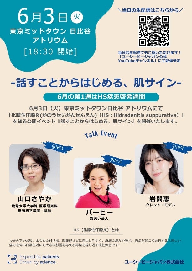 ユーシービージャパン株式会社(本社︓東京都新宿区、代表取締役社長︓菊池 加奈子)は、6 月 3 日(火)東京ミッドタウン日比谷にて「化膿性汗腺炎(かのうせいかんせんえん)〔HS︓Hidradenitis suppurativa〕」を知る公開イベント「話すことからはじめる、肌サイン」を開催いたします。