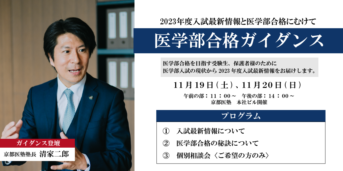 偏差値40からの医学部専門予備校、京都医塾株式会社(本社:京都市中京区 代表取締役 伊藤 章)は、2023年度の医学部受験者と保護者様を対象とした「医学部合格ガイダンス」を、2022年11月19日(土)、20日(日)の2日間限定で実施いたします。