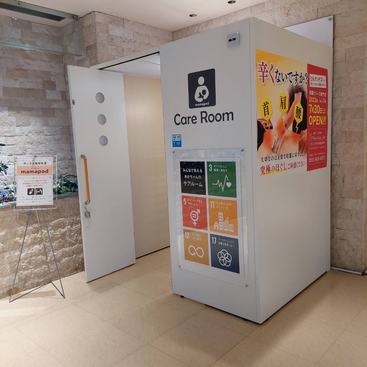 「mamapod」に代表されるような授乳スペースは、エンドユーザーからの需要も多く、また工事不要で外付けができることから、設置を検討している施設が近年増えています。株式会社丸井様も「授乳スペースが少ない」という社会的課題に共感し、丸井錦糸町店に「mamapod」の試験的設置を7月から開始しています。