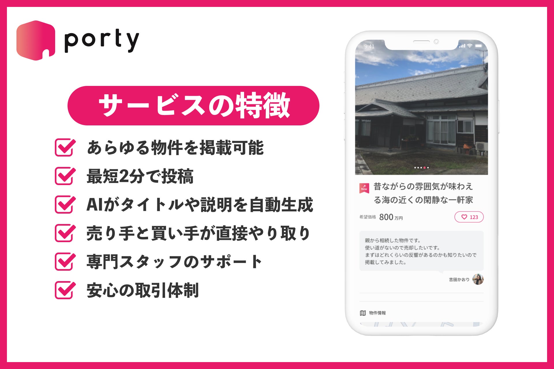 株式会社ポルティ(神奈川県川崎市、代表取締役:平瑶平、以下「ポルティ」)は、空き家の所有者と買い手を繋ぐマッチングアプリ「ポルティ」ならびに登録不要の即時査定「ポルティ空き家売却査定」(https://porty.co.jp/sale-assess)を正式にリリースしました。また、インクルージョン・ジャパン株式会社が運営するICJ2号ファンド投資事業有限責任組合よりシードラウンドにて5,000万円の資金調達を完了したことをお知らせいたします。今回リリースしたアプリ、Webサービスと調達した資金をもとに、相続した実家などの空き家や未活用土地を手軽に流通できるプラットフォームを構築し、日本が直面する空き家問題の解消と地方の地域活性の実現を目指します。
